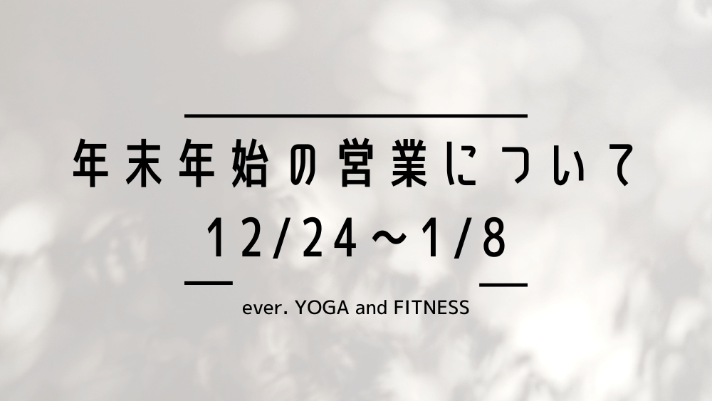 年末年始の営業について 公開日:2025年11月23日 ヨガ・フィットネス こんにちは!新潟県十日町市土市にある美姿勢になれる小さなヨガスタジオとパーソナルジムのever. YOGA and FITNESS(エバーヨガアンドフィットネス)です。 年末年始の営業についてお知らせいたします。 12月 […] 続きを読む