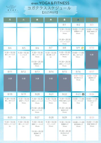 8月ヨガクラススケジュールと9月以降のレッスン休講日のお知らせ