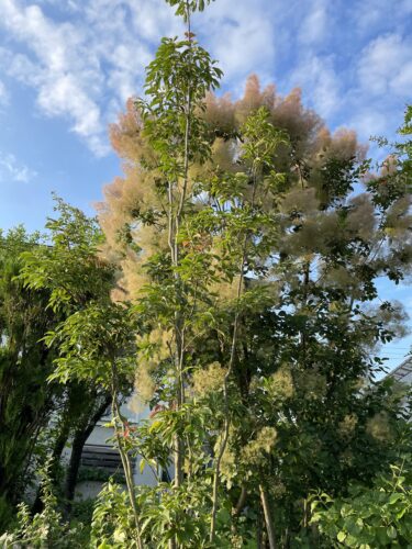 煙の木や白熊(ハグマ)の木とも呼ばれているそうです。雌木の枝先につく花序は長さ約20cmで多数枝分かれし、花後に伸びた花柄が遠くからは煙がくすぶっているように見えます。(雄木は花序が短く、煙状にはなりません。)